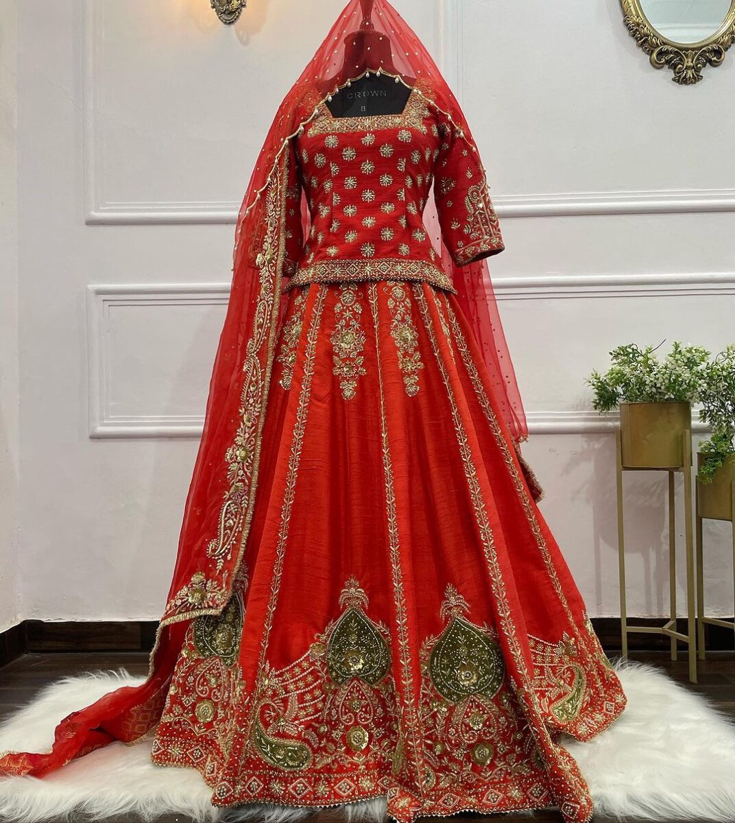Natural Red Bridal Lehenga, meticulously crafted from pure silk fabric and adorned with intricate Dabka handwork embroidery. This stunning ensemble is designed to captivate with its timeless elegance and impeccable craftsmanship. The rich natural red hue exudes sophistication and charm, while the intricate Dabka handwork embroidery adds a touch of opulence and grace. Paired with a luxurious bridal dupatta, this ensemble completes the bridal look with a flourish, offering a perfect blend of tradition and contemporary flair.